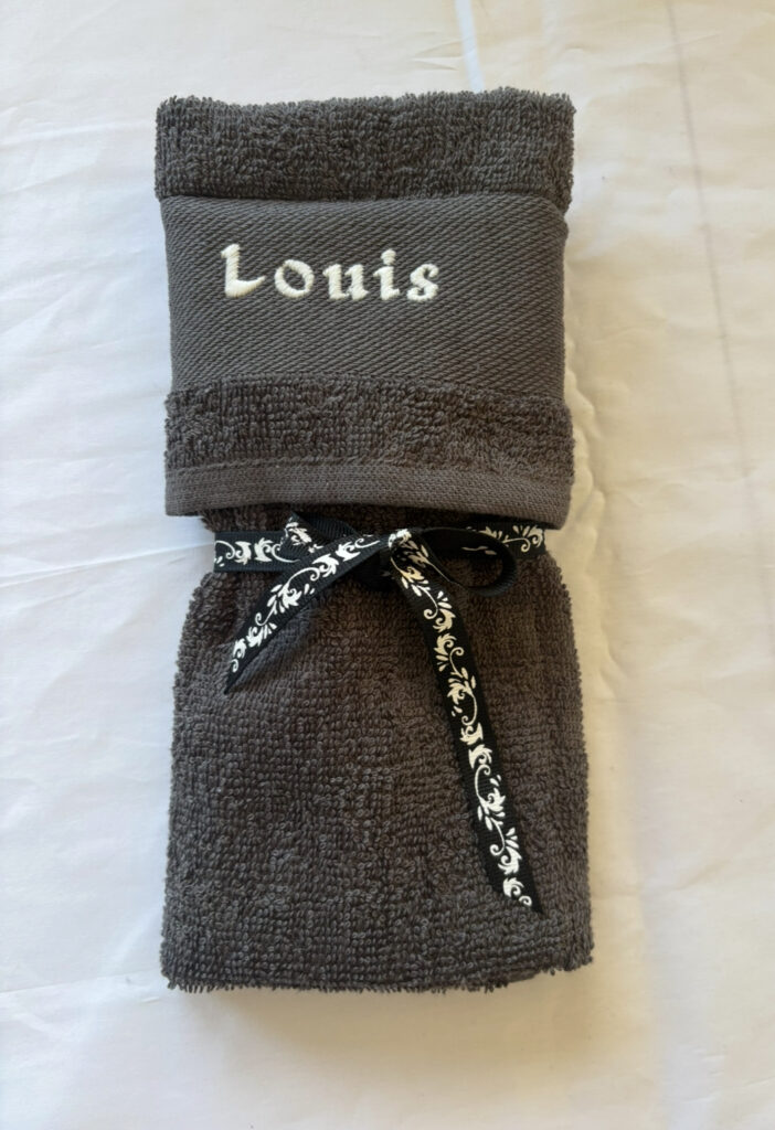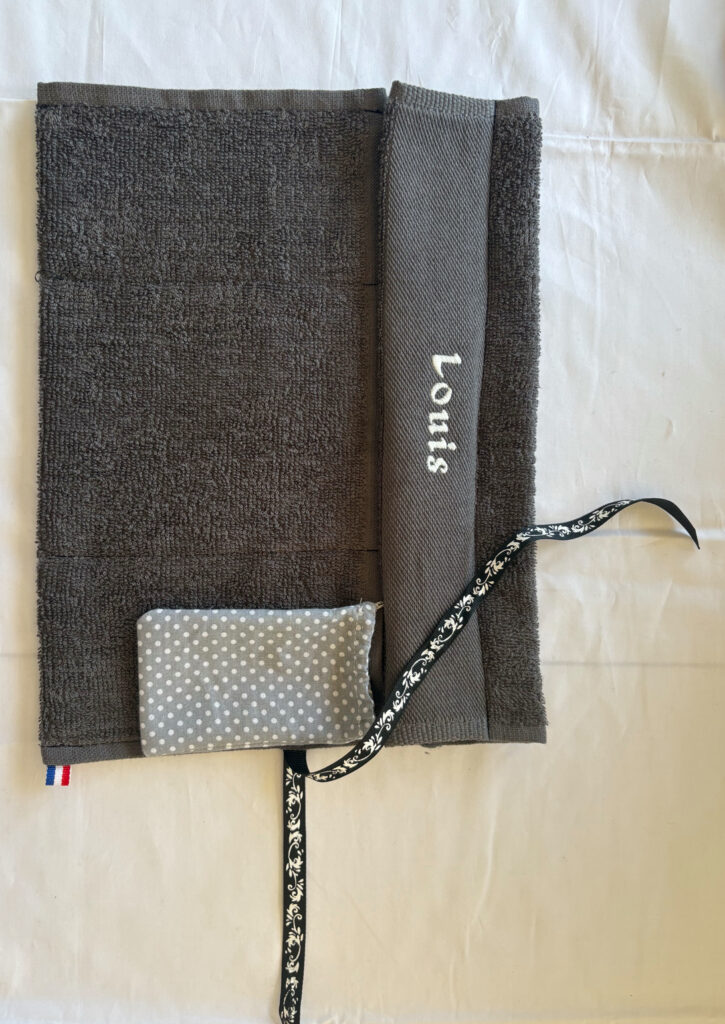 Je vous présente une jolie trousse de toilette faite maison, trois compartiments, une petite pochette pour les coton-tiges souvent oubliés, brodée au prénom de mon fils, elle est déclinable en différentes couleurs et diverses écritures.